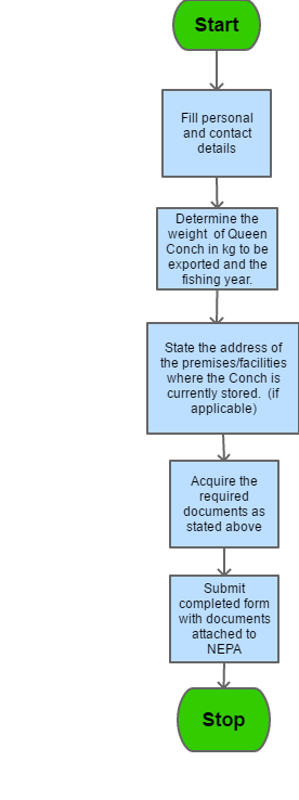 | 1 | Application Form for Individual Export Quota for Queen Conch (Strombus gigas) | This form is to be completed for an individual export quota for Queen Conch in keeping with The Endangered Species (Protection, Conservation and Regulation of Trade) Establishment of Individual Export Quota (Queen Conch, Strombus gigas) Regulations, 200 | National Environment and Planning Agency (NEPA) |