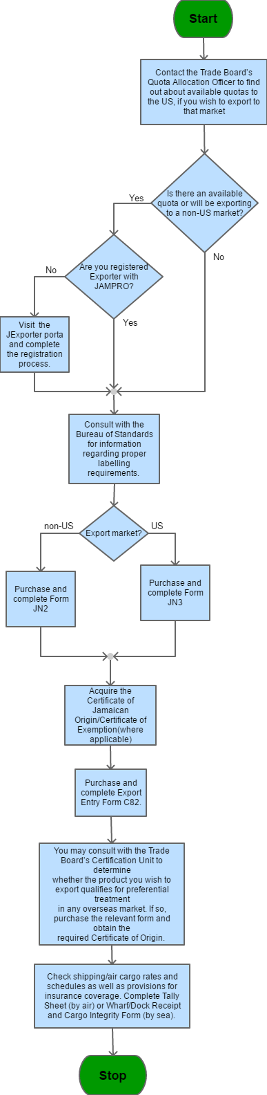 If there is an available quota or will be exporting to a Non -US market then: (i) Applicant then should determine whether or not they are registered with JAMPRO If there is not an available quota or will be exporting to a Non -US market then: (i) Consult with the Bureau Standards for information regarding proper labelling requirements