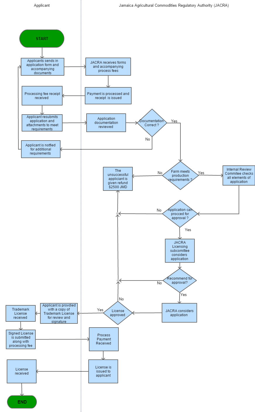 If the applicant meets farm production requirements then the Internal Review Committee will check elements of the application. However, if farm production requirements are not met the applicant will be notified that is application was unsuccessful and given a refund of JMD $2500 |