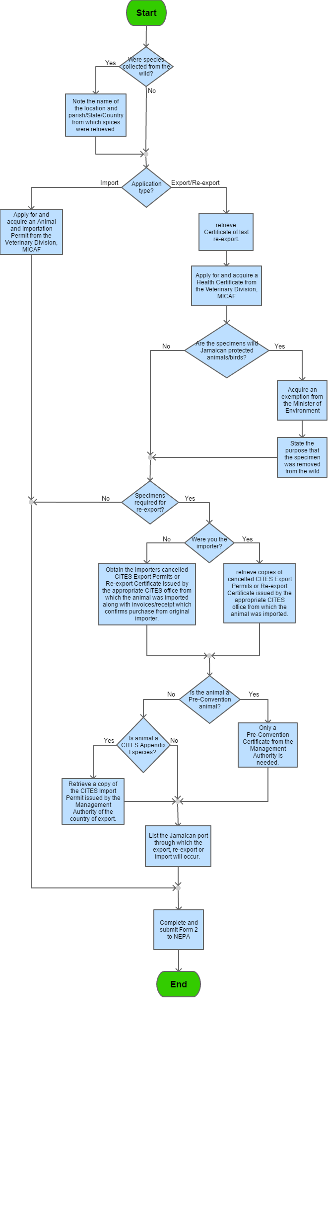 If the animal a "Pre-Convention" animal then: (i) Only a Pre-Convention Certificate from the Management Authority is needed (ii) List the Jamaican port through which the export, re-export or import will occur (iii) Complete and Submit Form 2 If the animal is not a "Pre-Convention" animal then: (i) Applicant must research if the animal falls under CITES Appendix I species |